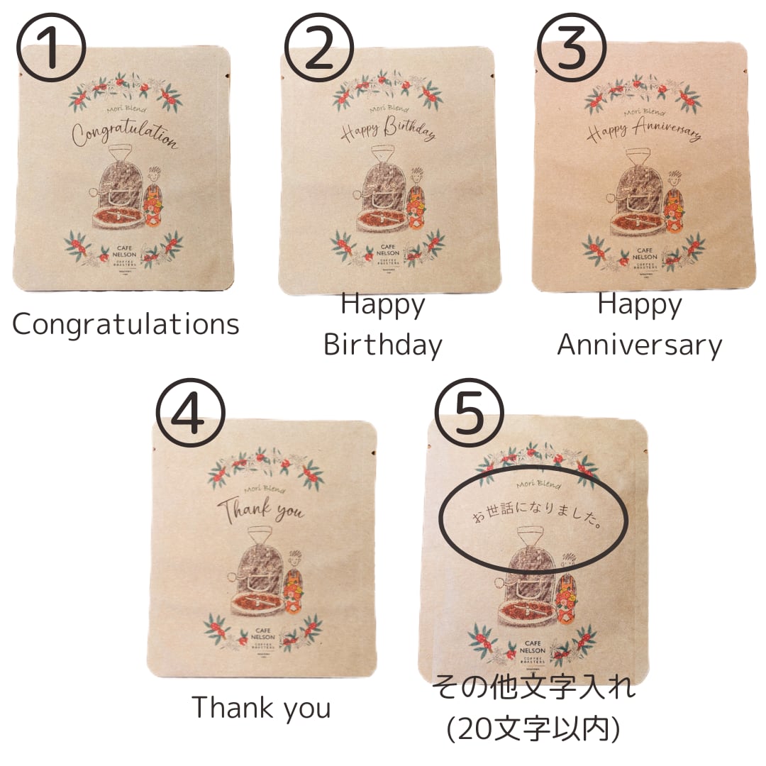 ギフトパッケージをご希望のお客様は、【種類】にてご用途に応じたデザインを選択して頂くか、【その他文字入れ】を選択のうえ、【ドリップバッグギフトパッケージ 文字入れ】項目にて20文字以内でご希望のメッセージをご入力下さい。